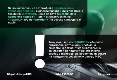 Тому якщо під час Е-Запису обираєте автомобіль автошколи, необхідно самостійно домовитися з навчальним закладом про подачу транспортного засобу з відповідною коробкою передач на майданчик сервісного центру МВС.
