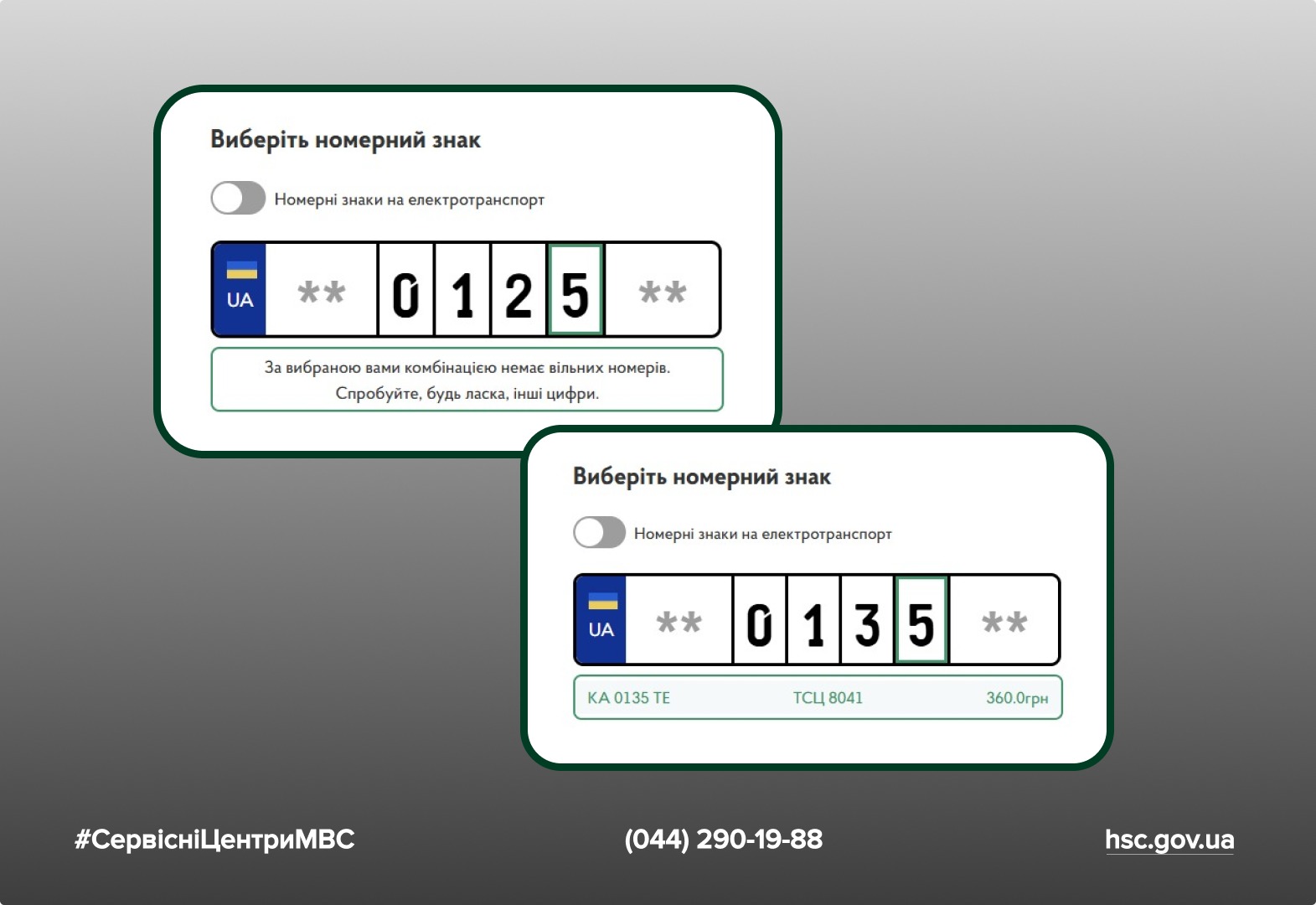 - 360 грн за бажану комбінацію цифр або від 2 400 до 96 000 грн за визначену платну комбінацію цифр (залежить від вибору комбінації та типу транспортного засобу).