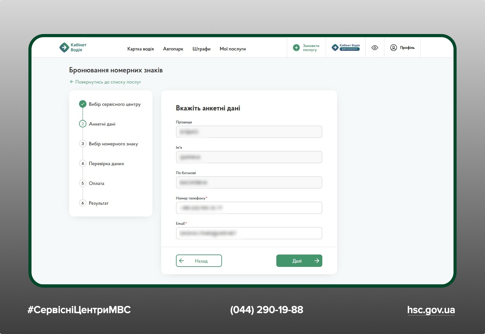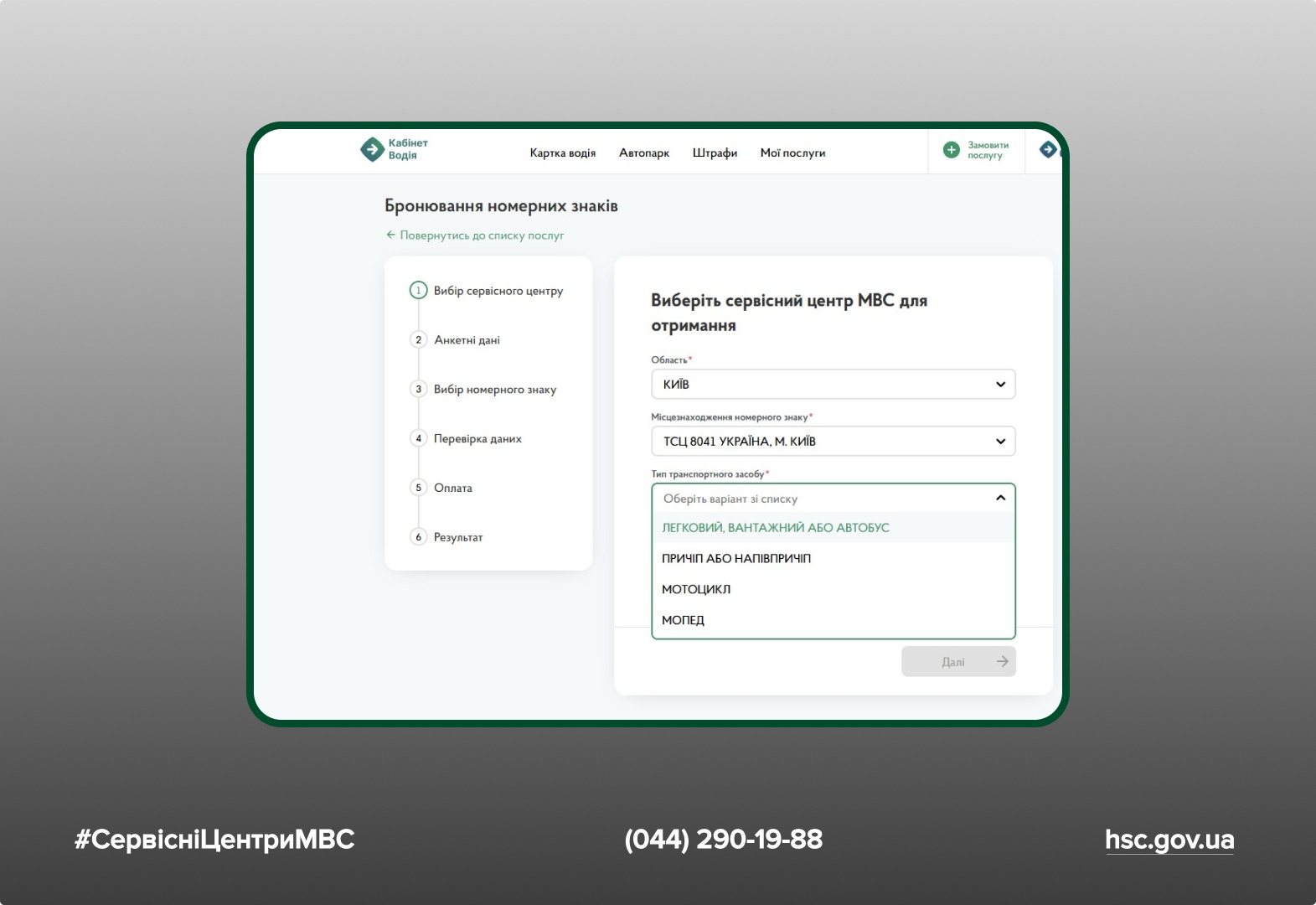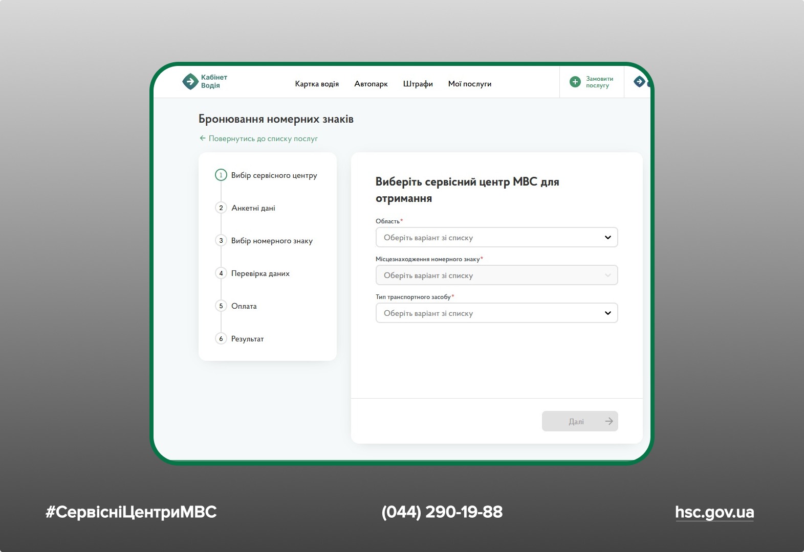 - Обрати послугу бронювання номерних знаків.